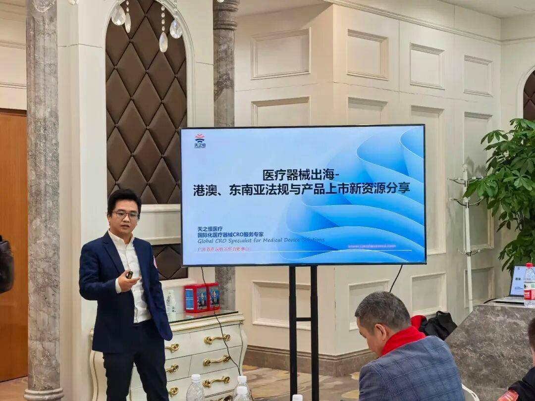 天之恒董事邓南天先生紧接着带来《医疗器械出海 - 港澳、东南亚法规与产品上市新资源分享》,为企业解锁新兴市场的 “掘金密码”。邓总用详实的数据勾勒出港澳及东南亚的 “市场潜力图”:香港老龄化加剧催生医疗需求爆发,东南亚 90% 以上的器械依赖进口,处处是机遇。随后,邓总拆解了港澳及东南亚的 “通关攻略”:香港 MDACS 准入法规、一步到位的注册流程,还有最高 1000 万港元的政府资助 “真金白银” 支持;东南亚东盟统一框架(AMDD)下,越南、马来西亚等国的注册要点与本地资源 “一网打尽”。搭配天之恒的合规注册、资金顾问服务,让企业开拓新兴市场 “少走弯路、快速落地”。