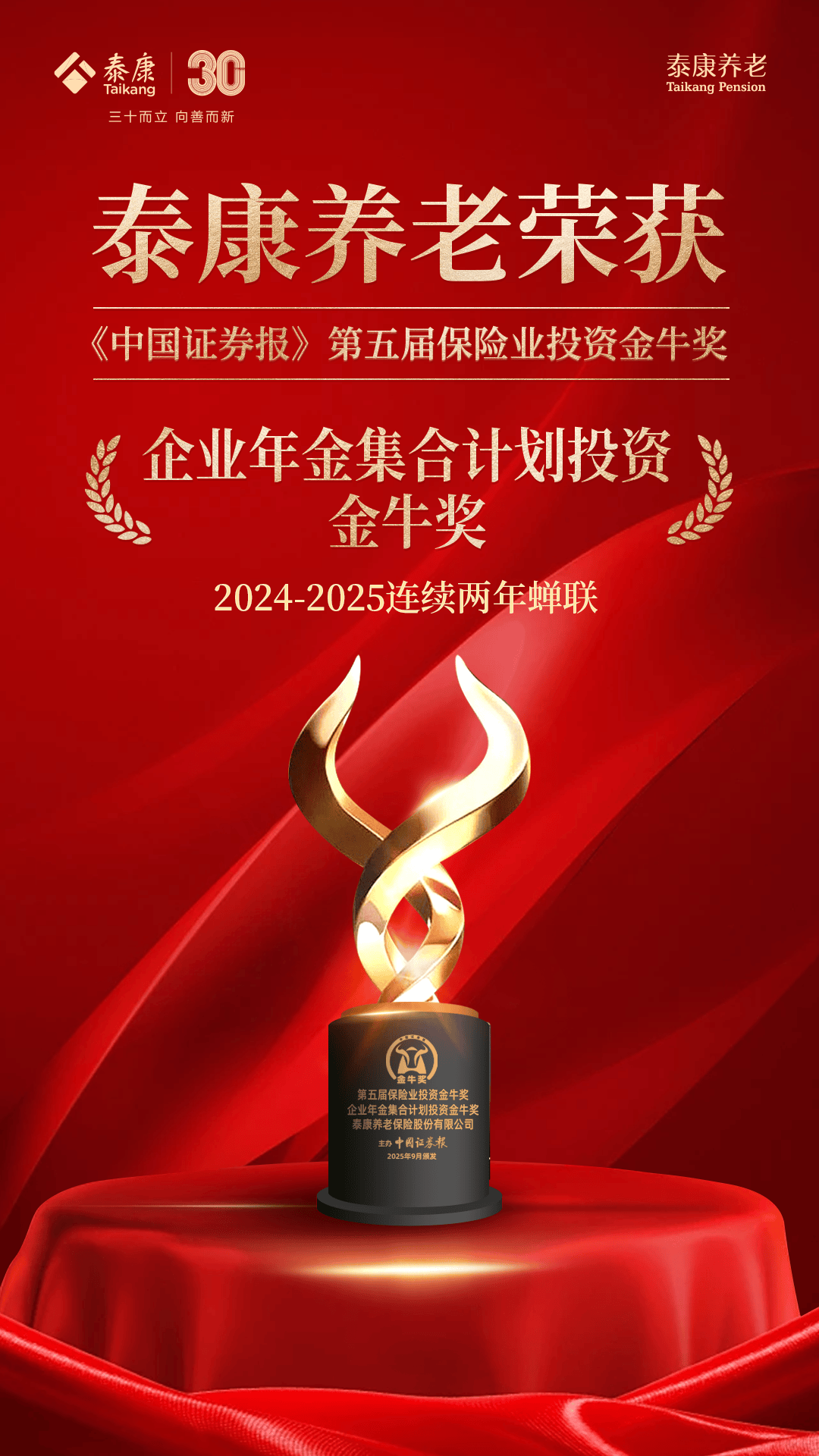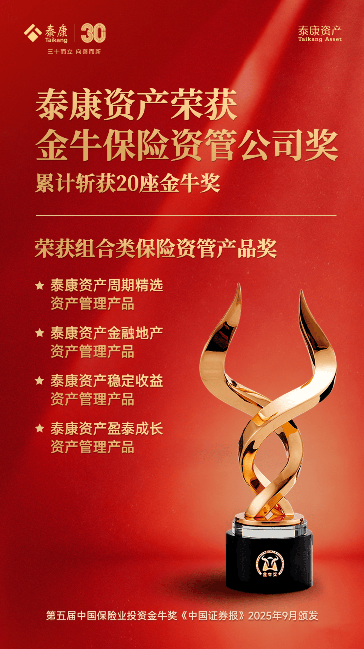 在《中国证券报》主办的第五届保险业投资金牛奖评选中,泰康资产荣获金牛保险资管公司奖;旗下泰康资产周期精选资产管理产品、泰康资产金融地产资产管理产品、泰康资产稳定收益资产管理产品、泰康资产盈泰成长资产管理产品荣获组合类保险资管产品奖。