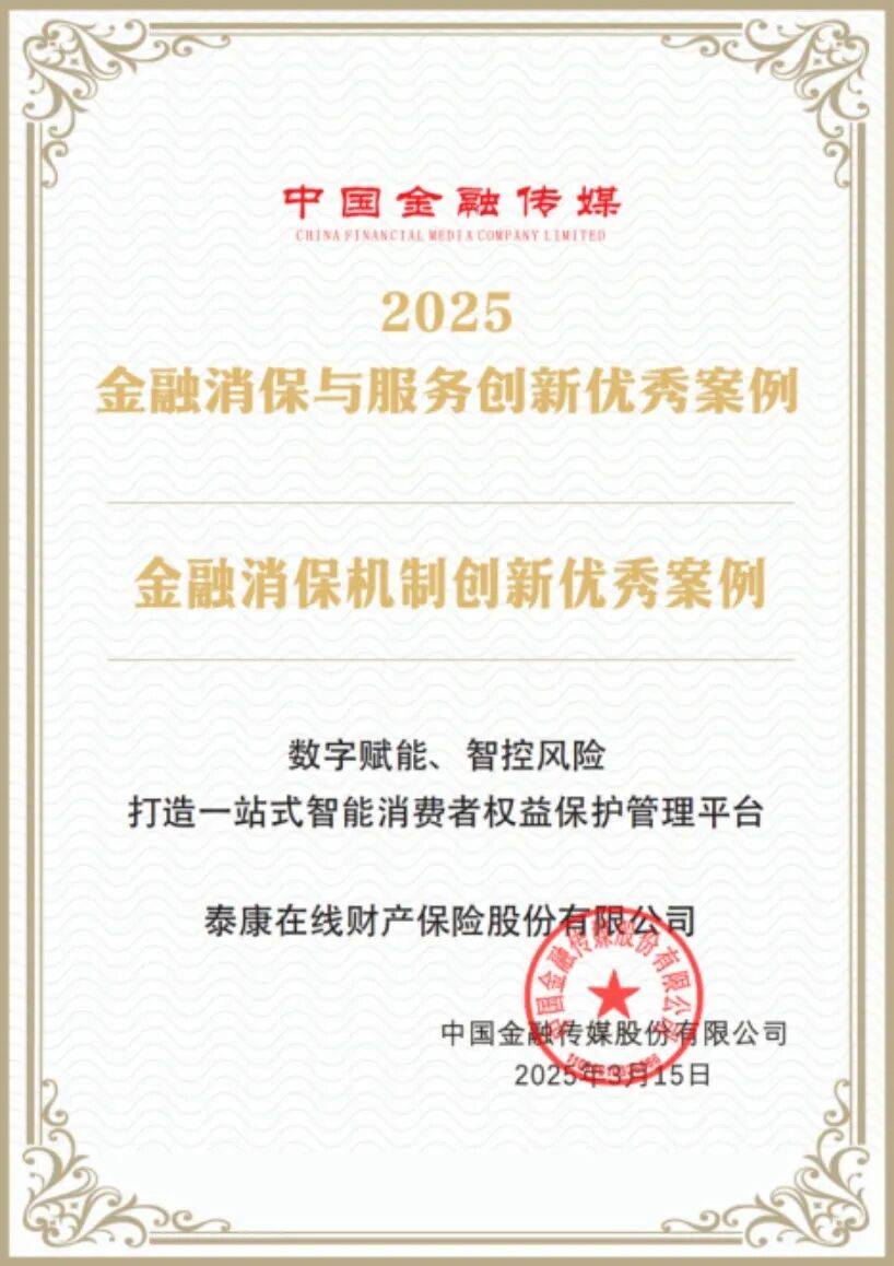 泰康在线持续筑牢消费者权益保护网络,“一站式智能消费者权益保护管理平台(CPIP)”荣膺“金融消保机制创新优秀案例”,为行业提供金融科技赋能消保工作的创新样本,为消费者提供更加安全、便捷、高效的金融服务体验。