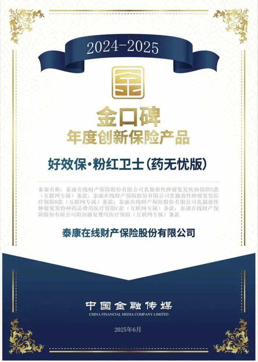 “好效保・粉红卫士”凭借在乳腺癌复发保障领域的持续创新与卓越服务,获评中国金融传媒“金口碑年度创新保险产品”,这不仅是对泰康在线长期深耕带病体保险领域的高度认可,更成为商业健康险从“保健康人”向“保人健康”转型的成果展示。