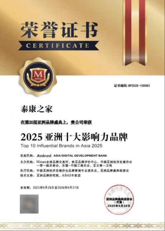 在“第20届亚洲品牌盛典”中,泰康之家荣获“2025亚洲十大影响力品牌”。