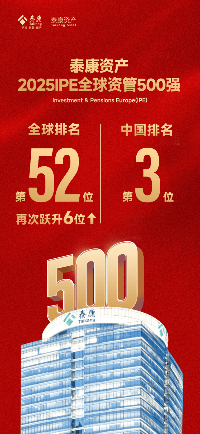 在国际知名财经媒体机构Investment & Pensions Europe(IPE)发布的“2025全球资管机构500强”榜单中,泰康资产位列IPE全球资管500强全球第52位,全球排名再次跃升6位,位列中国第3位。