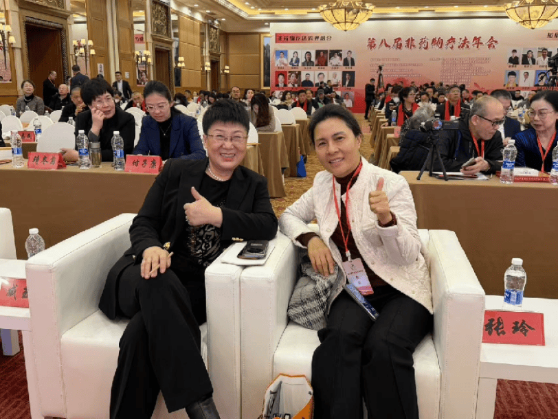 北京京中中西医结合医院院长、中国民族医药协会非药物疗法专业委员会副会长张玲女士(右)与山东富溪生物科技有限公司董事长、非药物疗法专业委员会副会长臧玉娜女士(左)在会场合影