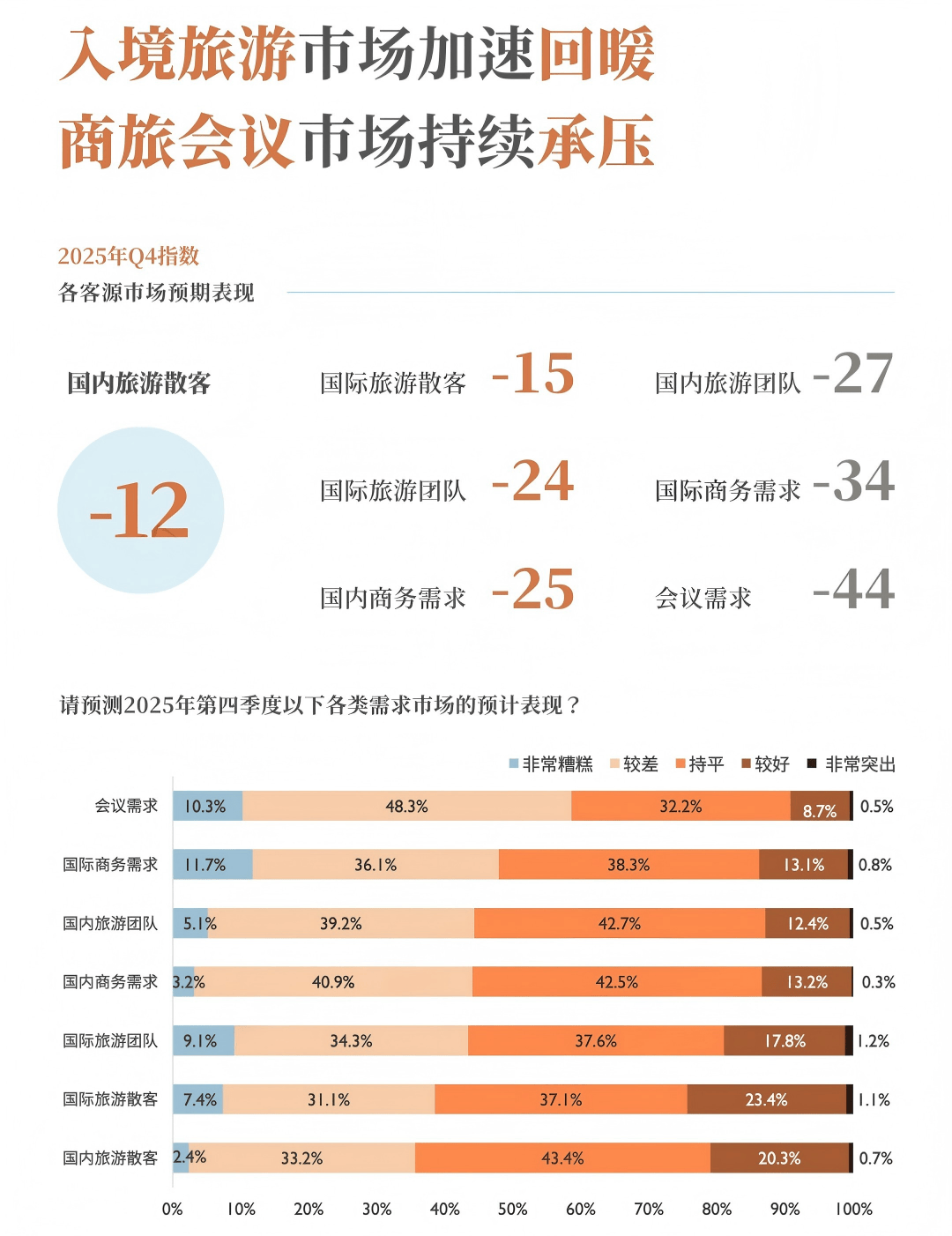 据厚海平台数据显示,2025年第四季度,各细分需求市场中会议及商旅需求的预期依然在各板块中垫底,会议需求指数虽有反弹但仍最为悲观。