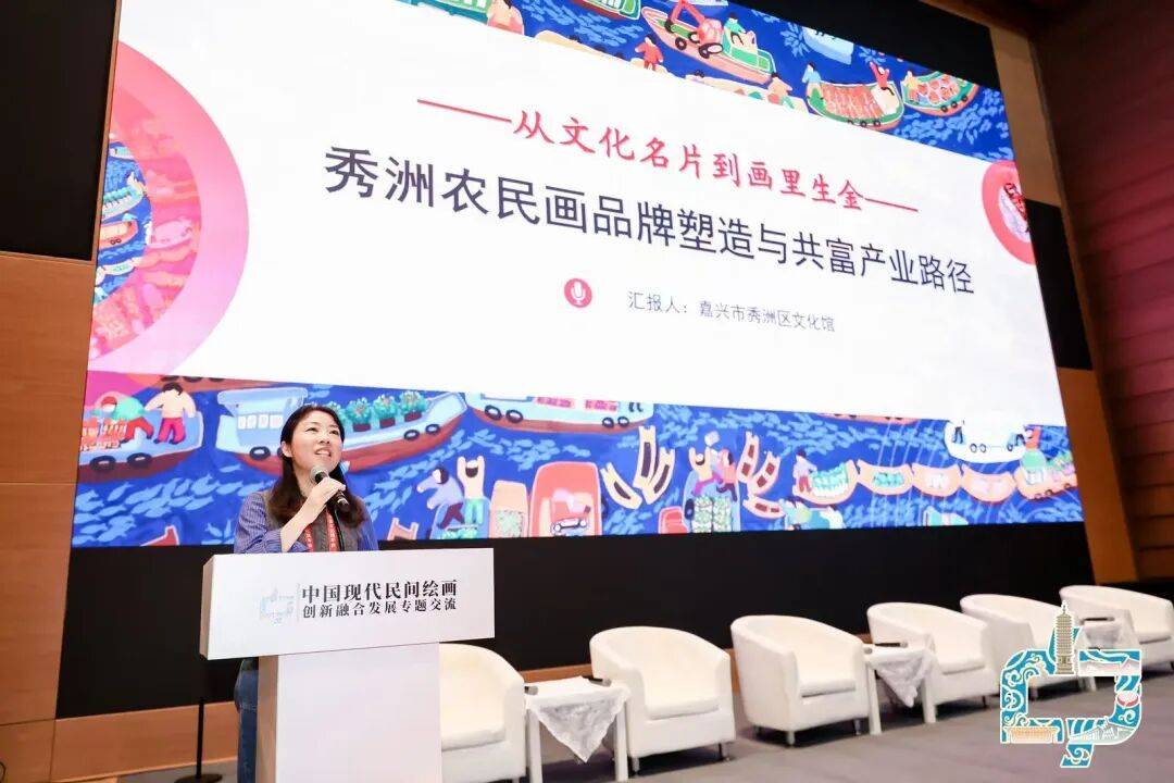 在随后开展的中国现代民间绘画创新融合发展专题交流会上,国内民间绘画领域的专家学者与画乡代表齐聚一堂,通过主旨演讲、案例分享与学术对谈,深入探讨民间绘画的文化内涵与当代价值。秀洲区以《从文化名片到画里生金:秀洲农民画品牌塑造与共富产业路径》为题,分享了四十余年来的探索经验。